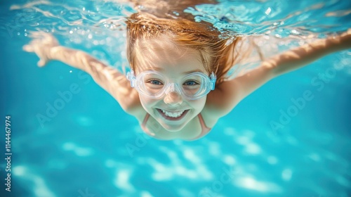 © 69, Naklejka premium Young Girl Swimming Underwater in Bright Sunny Pool Water