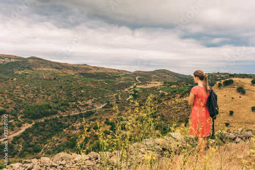 © annanahabed, Naklejka premium Young girl tourist admiring landscape of Cap de Creus, National Park on the Costa Brava, Spain