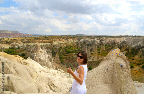 © Maria Kasimova, Naklejka premium Young girl traveller standing in the valley of Cappadocia Turkey.