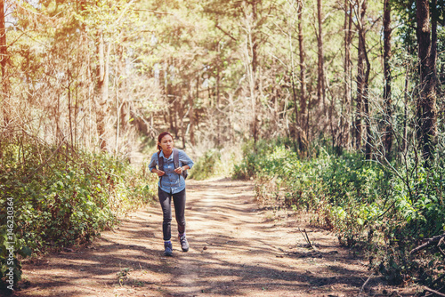 Fototapeta premium Young girl walking in pine forset for go to target.
