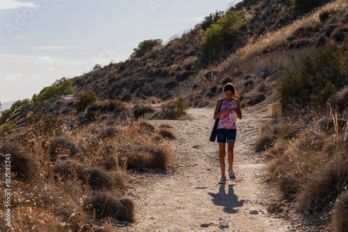 © Malik, Fototapeta premium Young girl walking on a natural hiking trail with rock pavements while looking at her mobile phone. Technology and nature contrast.