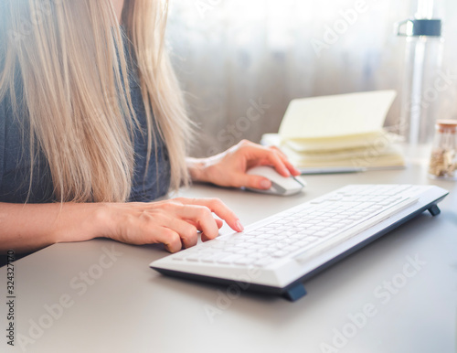 © conssuella, Fototapeta premium young girl works at a computer from home