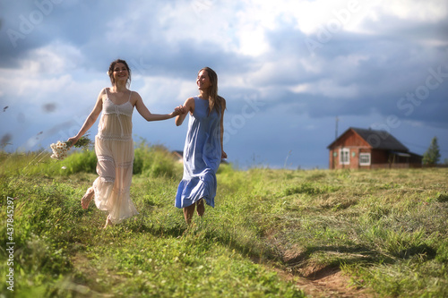 © alexkich, Fototapeta premium Young girls are walking in the field