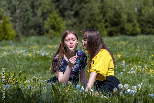 Fototapeta premium Young girls have fun time in the park. Girl blowing on fluffy dandelion...