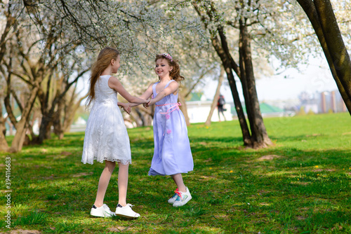 Naklejka premium Young girls with blue eyes in white dresses in garden with apple trees blosoming