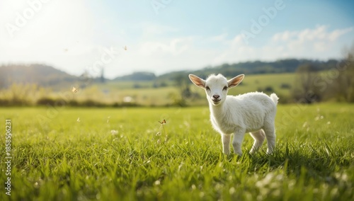 Obraz premium Young goat in a grassy outdoor setting during spring, highlighting livestock...