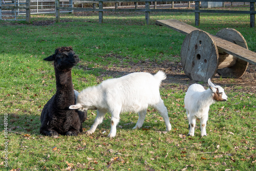 © Penny, Naklejka premium young goat kid headbutting a pretty black alpaca with a seesaw in the background