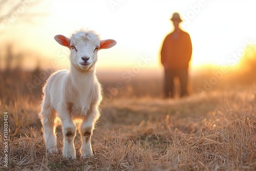 © Margarita, Obraz premium Young Goat with Farmer in Rustic Countryside Scene Enjoying Autumn Sunlight
