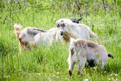 Obraz premium Young goats grazing in a green meadow on a sunny day