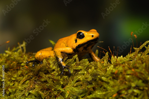 Fototapeta premium Young golden poison frog "Blackfoot" on a mossy branch