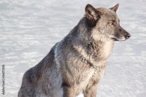 Fototapeta premium Young gray canadian wolf on white snow.