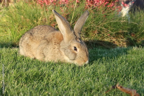 Fototapeta premium young gray rabbit eats juicy grass on the lawn