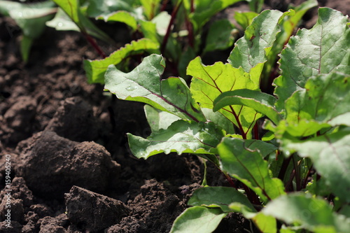 Fototapeta premium Young green beetroot plans on a path in the vegetable garden