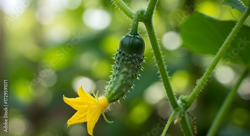 © RUMA, Naklejka premium Young green cucumber with yellow flower on vine in garden young cucumber plant