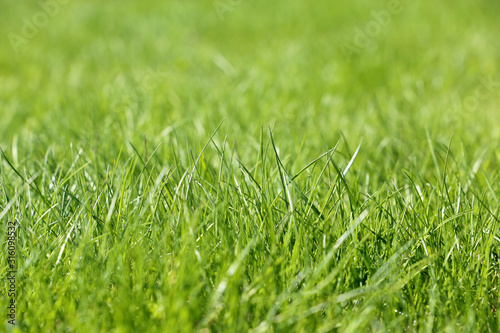© Oleg, Fototapeta premium Young green grass in sunlight, selective focus. Fresh spring nature background, sunny meadow texture