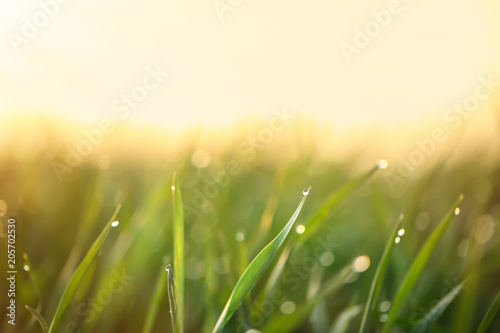Fototapeta premium Young green grass with dew drops on spring morning, closeup
