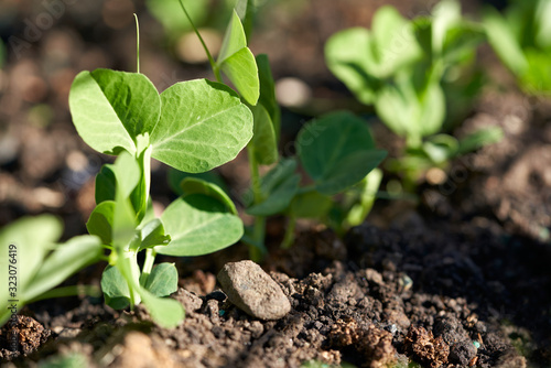 Obraz premium Young green pea seedlings, plants, growing in a vegetable garden outside....