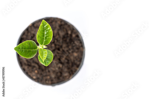 © SKT Studio, Naklejka premium Young green plant in small black pot isolated on white