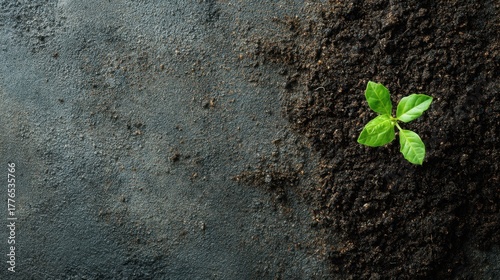 Fototapeta premium Young green plant sprout emerging from dark soil on a textured background. Concept of growth, nature, new life for Earth Day or environmental themes.