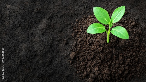Naklejka premium Young green seedling with healthy leaves emerging from a mound of rich dark soil, symbolizing new life and growth