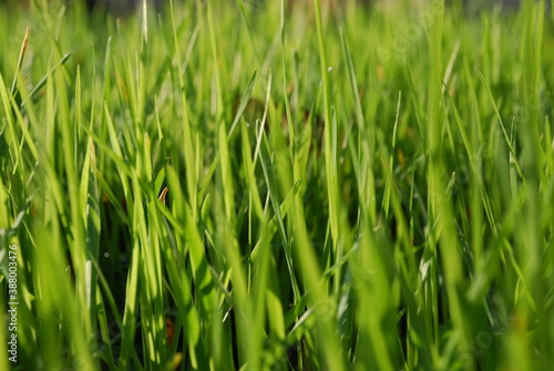 © Andrew_Swarga, Obraz premium Young green shoots of grass. Close-up on young shoots of green grass. The sun illuminates the shoots at an angle part of the leaves in the sun part in the shade of other leaves.