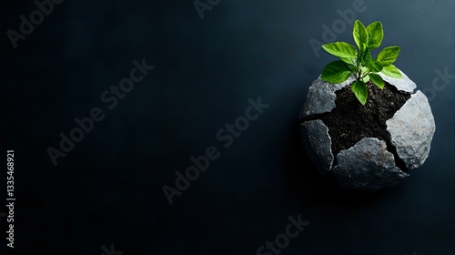 Naklejka premium Young green sprout growing from cracked stone sphere on dark background, symbolizing breakthrough, resilience and new beginnings in business concept.
