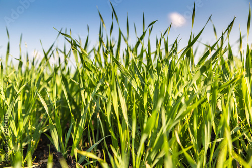 Obraz premium Young green wheat growing in soil.