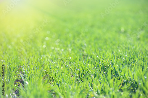 Fototapeta premium Young green wheat grows in the field. Rows with sprouts of wheat. Sunny spring morning.