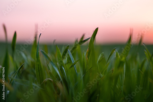 © Volodymyr_sh, Fototapeta premium Young green wheat seedlings growing on a field. Agricultural field on which grow immature young cereals, wheat. Wheat growing in soil. Close up on sprouting rye on a field in sunset. Sprouts of rye.