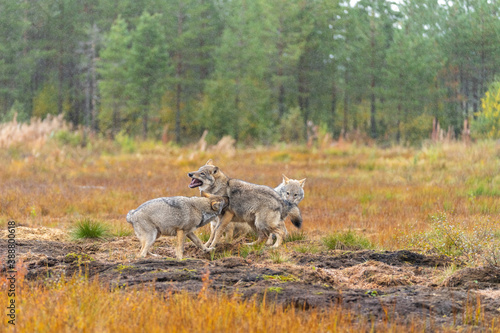Obraz premium Young Grey wolfs are playing together on the Finnish swamp.