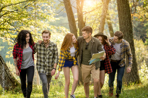 Fototapeta premium young group of hikers having fun while travelling, friendship, team concept, relation