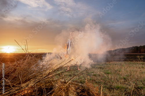 © Oleh, Obraz premium young guy crying in fire in burnt clothes, war, home destruction, human disappointment