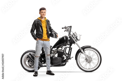 © Ljupco Smokovski, Obraz premium Young guy holding helmet and posing next to a custom motorbike