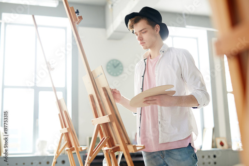 Obraz premium Young guy in casualwear and hat holding palette while standing in front of easel and painting