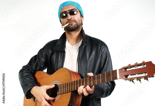 Obraz premium young guy in dark glasses and bandana, with a guitar