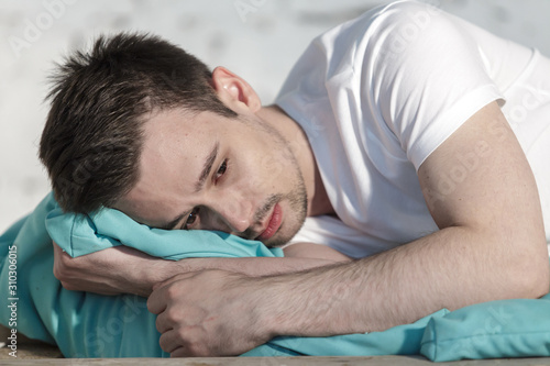 Fototapeta premium Young guy in white clothes depressed on a bed closeup