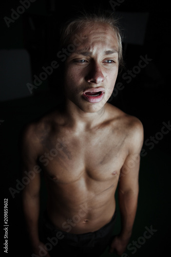 © pha88, Fototapeta premium Young guy on a dark background.A strong athletic young man model.Beautiful lips and smile.Beautiful body.