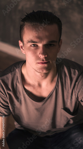 Fototapeta premium young guy sitting on the floor at home a warm beam will fall on his face