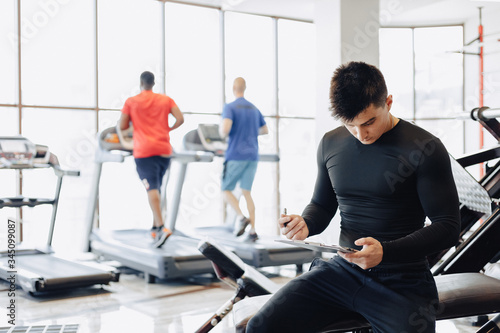 Obraz premium young guy trainer takes notes in the gym. personal trainer for sports.
