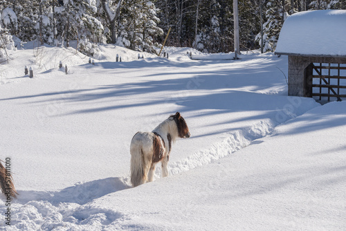 Naklejka premium Young Gypsy Vanner horse outside in winter snow