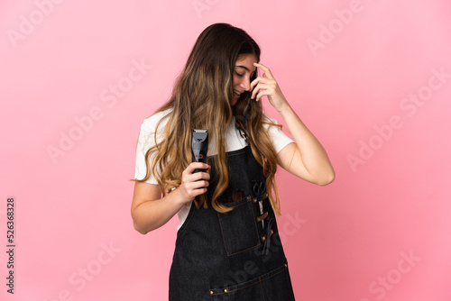 Fototapeta premium Young hairdresser woman isolated on pink background laughing