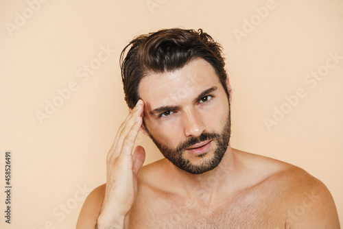 © Drobot Dean, Obraz premium Young half-naked man rubbing his temple and looking at camera