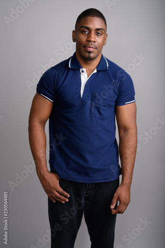 © Ranta Images, Fototapeta premium Young handsome African man wearing blue polo shirt against gray