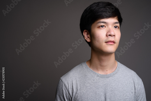 © Ranta Images, Fototapeta premium Young handsome Asian man thinking against gray background