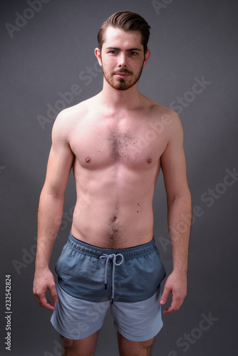 © Ranta Images, Fototapeta premium Young handsome bearded man shirtless against gray background