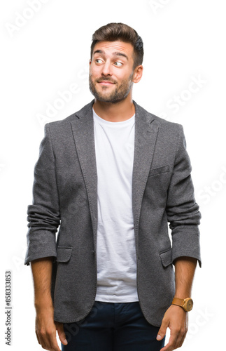 © Krakenimages.com, Fototapeta premium Young handsome business man over isolated background smiling looking side and staring away thinking.