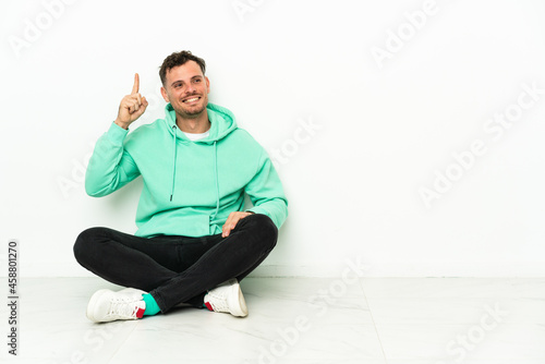 Fototapeta premium Young handsome caucasian man sitting on the floor intending to realizes the solution while lifting a finger up