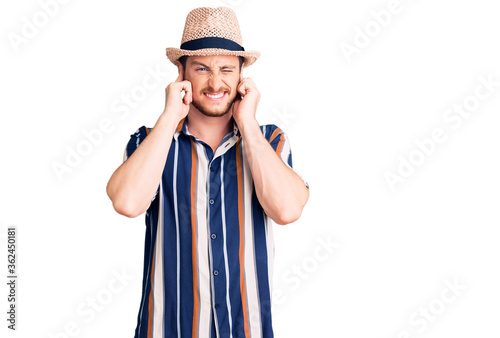 Fototapeta premium Young handsome caucasian man wearing summer hat covering ears with fingers with annoyed expression for the noise of loud music. deaf concept.