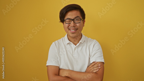 © Krakenimages.com, Obraz premium Young, handsome, chinese man in a white shirt smiling and winking while standing with folded arms against a vibrant yellow background