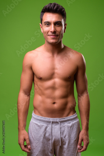 © Ranta Images, Fototapeta premium Young handsome Hispanic man shirtless against green background